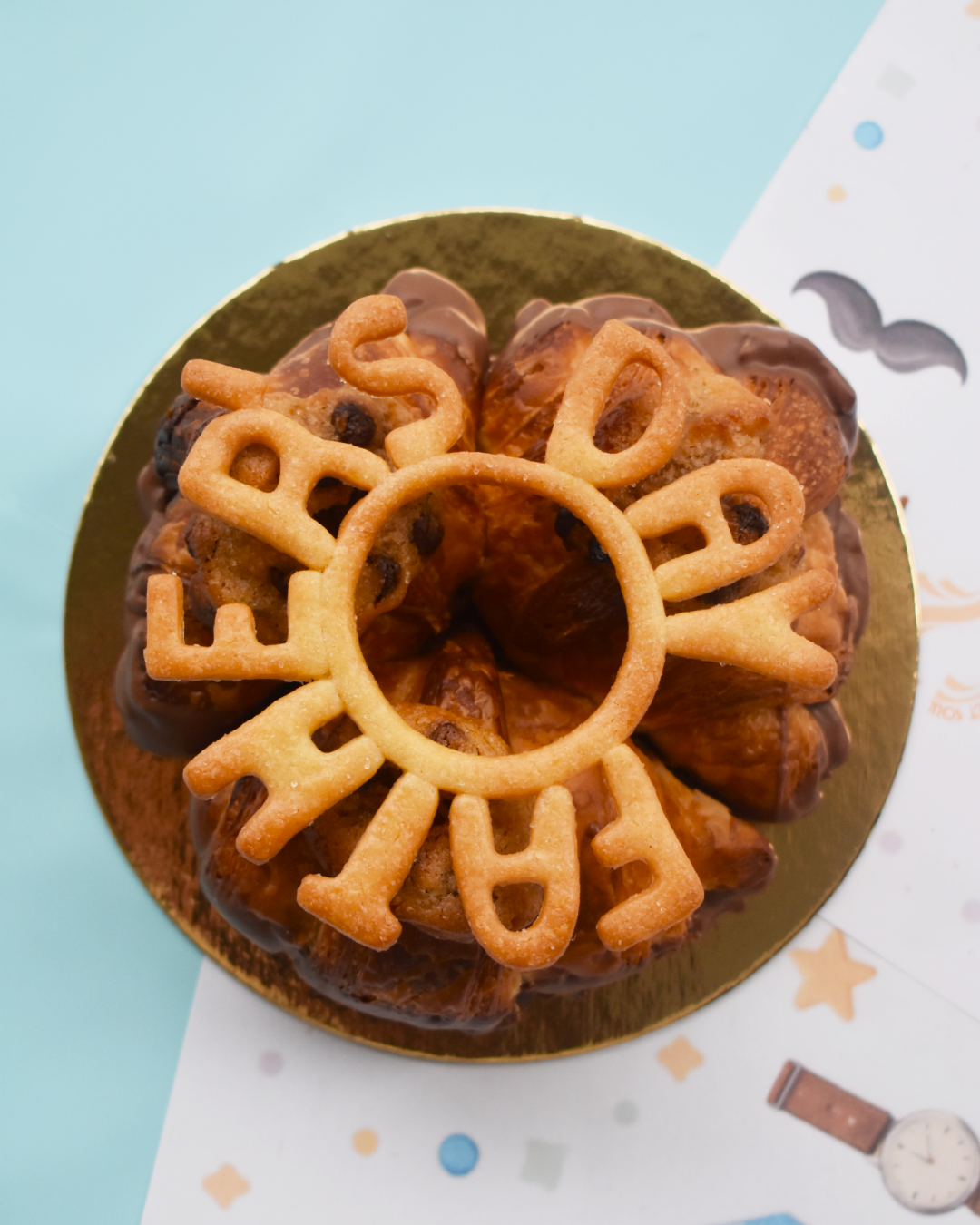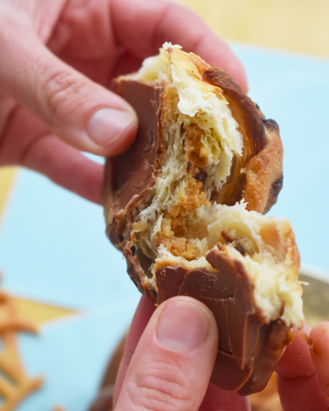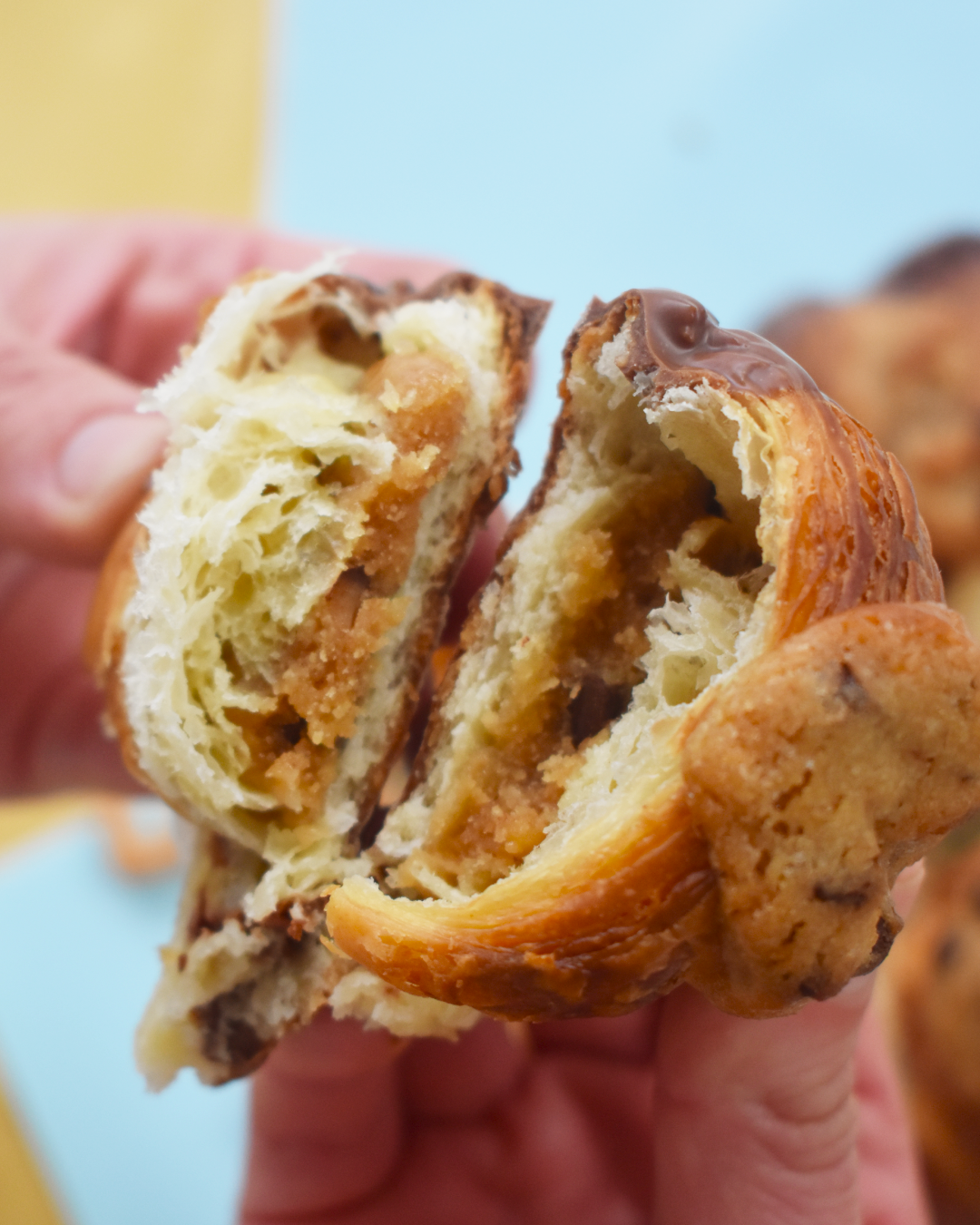 Croissant folhado amanteigado recheado com massa de cookie e base mergulhada em chocolate.