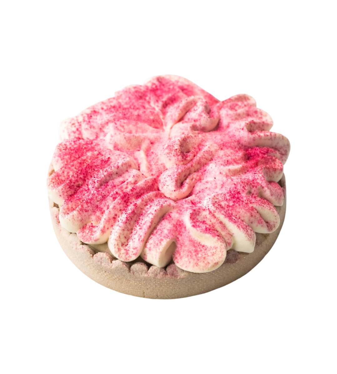 Base sablé, financier de pistacho, namelaka de pistáchio, coulis de framboesas e ganache montada de chocolate branco.